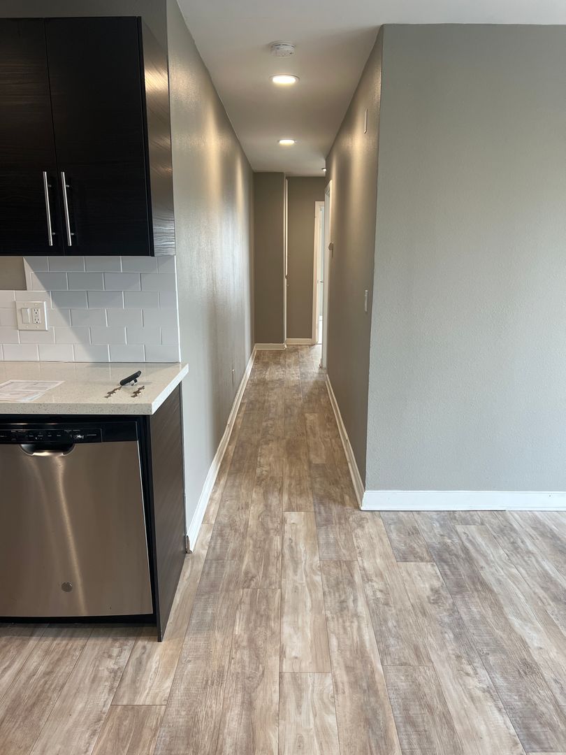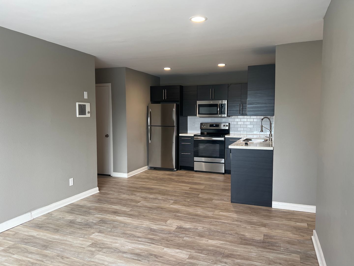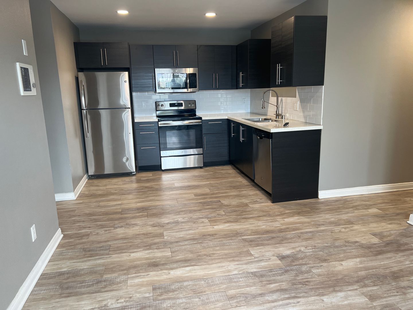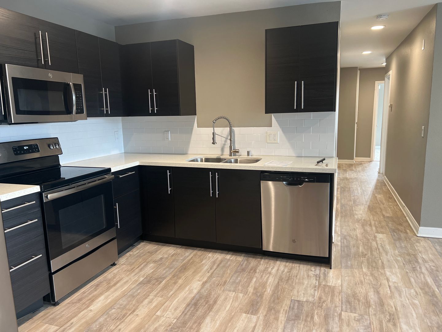 updated kitchen with stainless steel appliances: dishwasher, microwave, refriderator and electric stove.