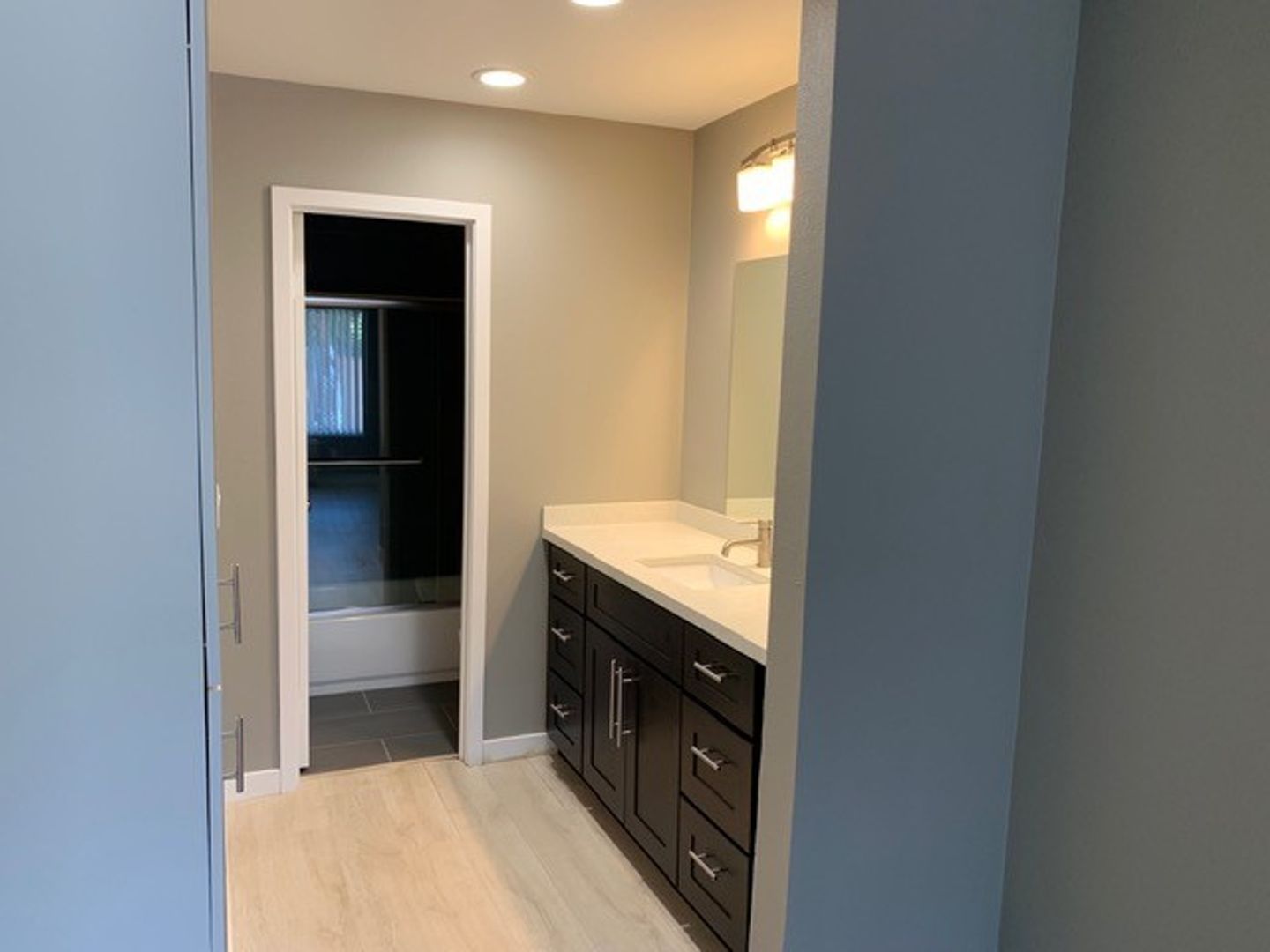Interior features include fully equipped kitchen with stainless appliances including dishwasher, electric stove, microwave, and refrigerator. There is plank flooring throughout apartment and quartz countertops, and newer frameless cabinets.