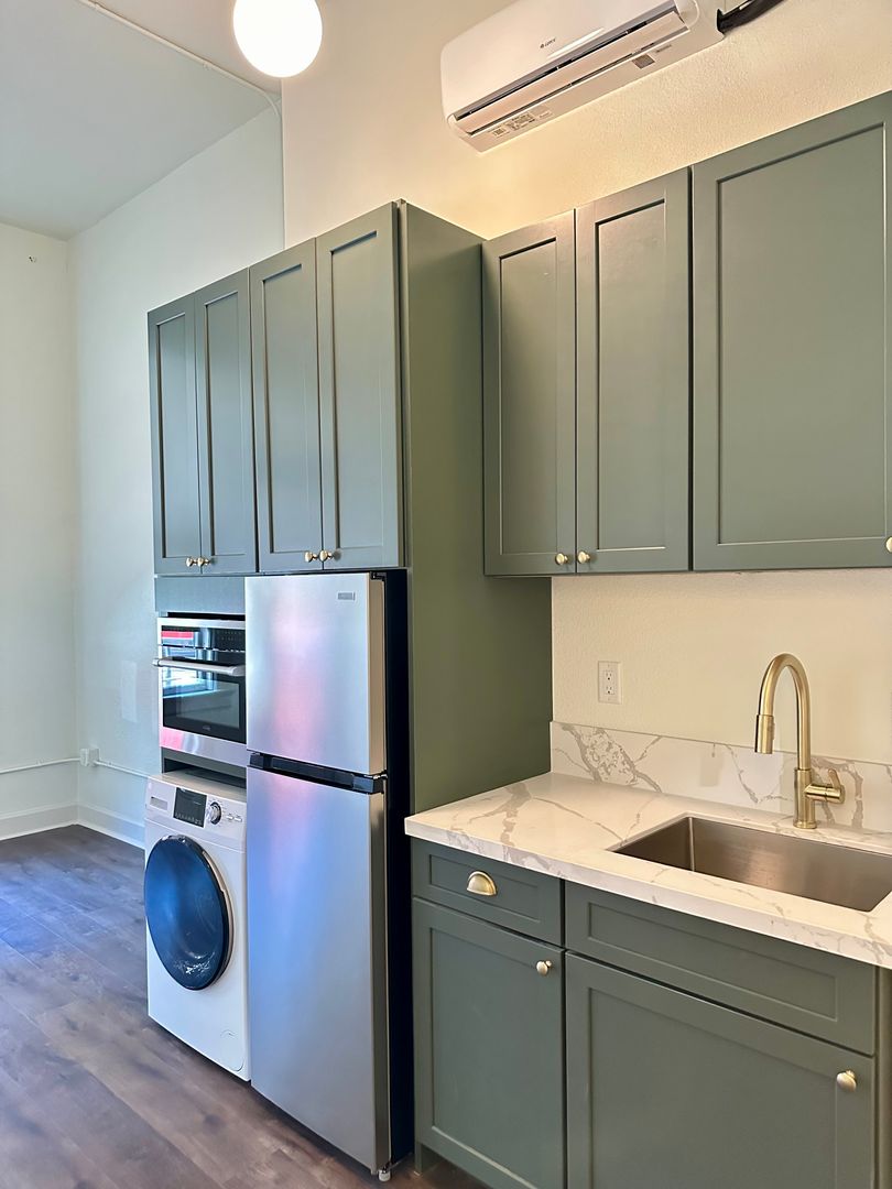 Each unit boasts a brand-new kitchen and modern appliances including a refrigerator and microwave/oven combo, and cook top hot plate, ensuring that you have the best of both worlds. You'll also love the natural light that floods in through large windows, making your living space warm and inviting and a/c to help keep cool on those warm San Diego days. Additional bonus SF with the addition of loft space above the bathroom. This space has built-in ladder access, electrical outlet, light fixture, and space to fit a twin mattress if desired. This unit also has an in-unit washer/dryer.